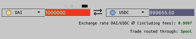 そもそもカーブとはステーブルコイン(USDC、DAI や UST 等)や wBTC 等を取引するにあたり、スリッページを最小限に抑えられる取引所ということで知られています。(スリッページとは注文を出した価格と実際に成立した価格との差のことを指すのです。) 例えば DAI と USDC を取引するのに、カーブとスシ($SUSHI)を使ったとします。(カーブのレトロ感すごいですよね。笑)