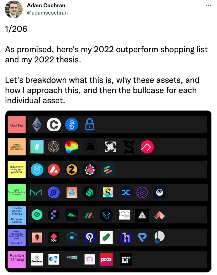 今日は暗号資産関連のエンジェル投資家、アダム・コチュラン氏が昨年末に投稿した『2022 年に大きく成長すると見込んでいる買物リスト』と題した206ツイートをピックアップします!
