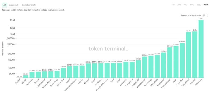 伝統的な株式市場の場合、このような大きなハイプ(投機的成長)が生じるとき、この以上な利益を確保するために、投機的資産から安全資産(バリュー)へとローテンションが起きます。今まで暗号資産の場合、その中でバリューに該当するようなものは存在せず、基本全て『将来の成長』を目がけた投機的資産でした。 しかし、最近では、実際に売上を立ているプロトコールが出てきているのが下記の図からわかります。
