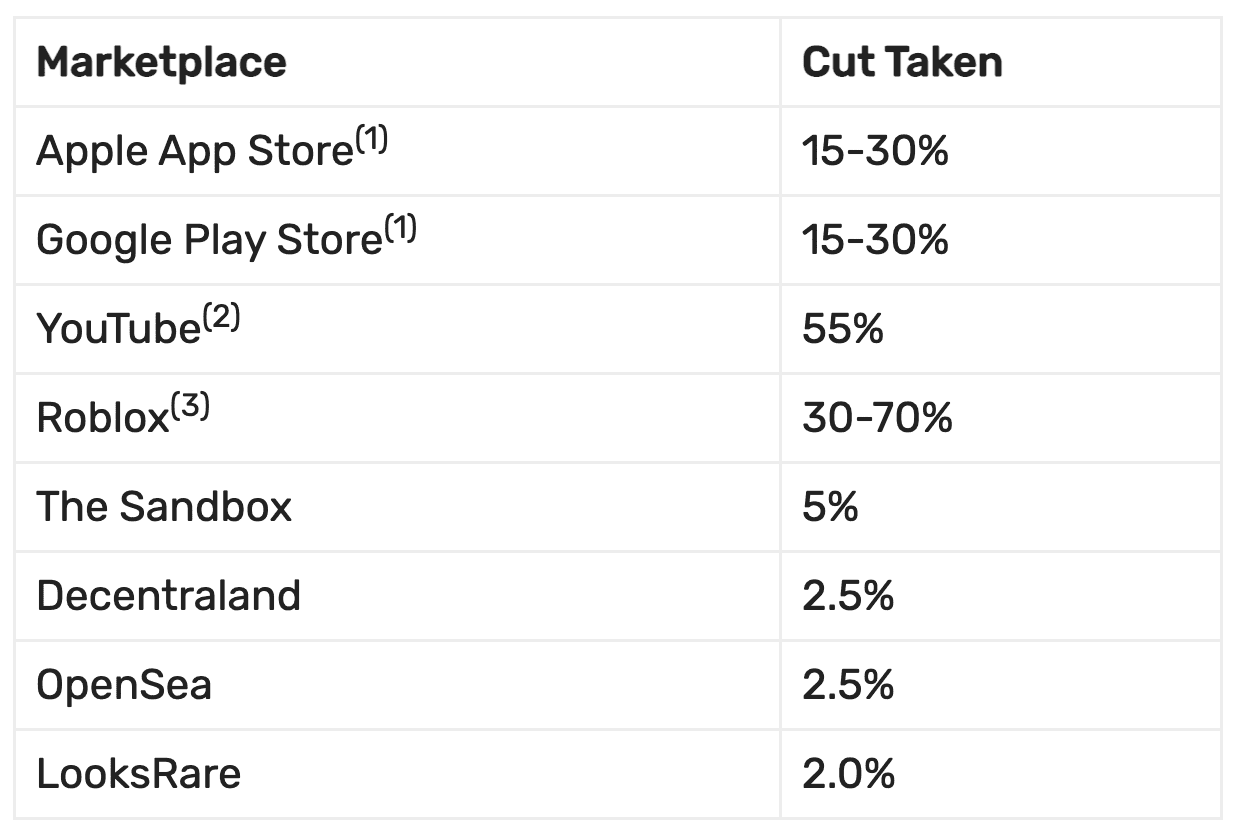 メタが運用する VR プラットフォームのホライゾン・ワールズにて販売される NFT について 47.5%の手数料をとると発表。他社と比較すると以下のような表に: