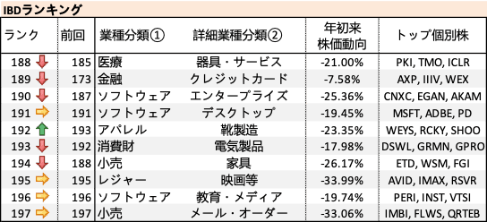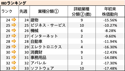 詳細業種分類ごとに、年初来の増加率以外の要素も含めて強い業種を並べた IBD ランキング。
