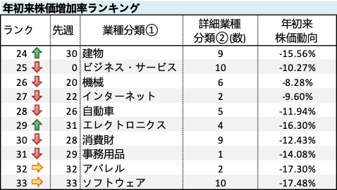 *年初来株価動向は、詳細業種分類 ② 別の平均でランキングは高い順に示している