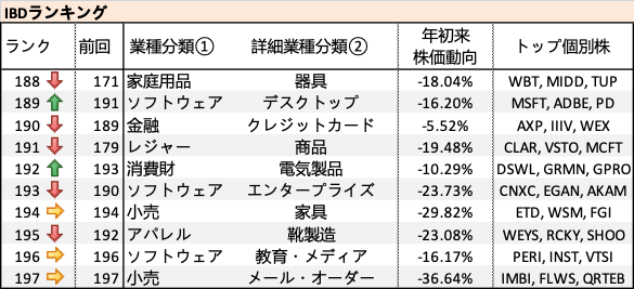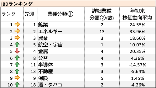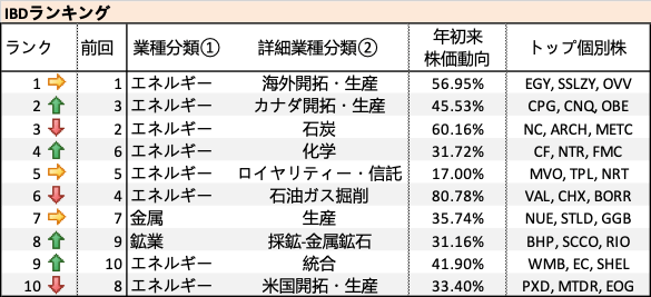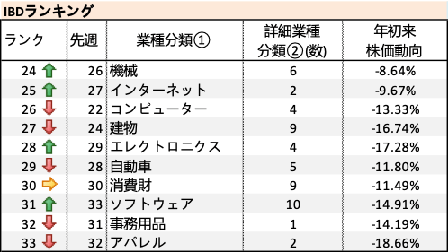 詳細業種分類ごとに、年初来の増加率以外の要素も含めて強い業種を並べた IBD ランキング。