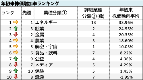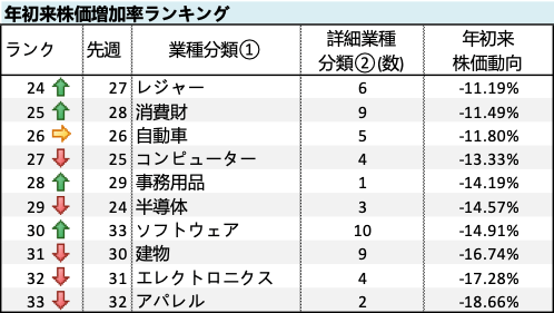 *年初来株価動向は、詳細業種分類 ② 別の平均でランキングは高い順に示している