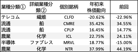 引き続き圧倒的にエネルギーが年初来で強いですね。その後は金属・鉱業が続木、農業関連も上昇が続いています。半導体がようやくトップに戻ってまいりました。