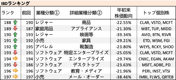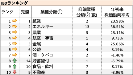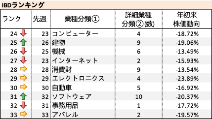 詳細業種分類ごとに、年初来の増加率以外の要素も含めて強い業種を並べた IBD ランキング。
