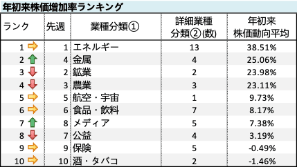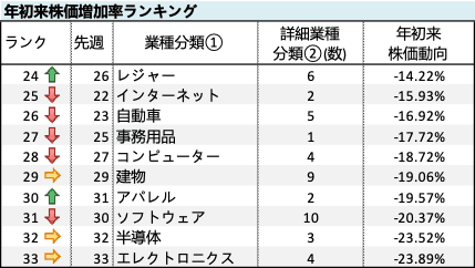 *年初来株価動向は、詳細業種分類 ② 別の平均でランキングは高い順に示している