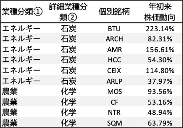引き続き圧倒的にエネルギーが年初来で強いですね。その後は金属・鉱業が続き、農業関連も上昇が続いています。半導体がようやくトップに戻ってまいりました。