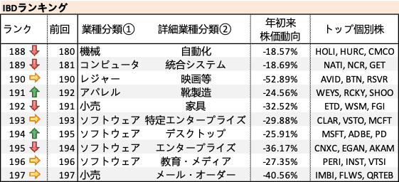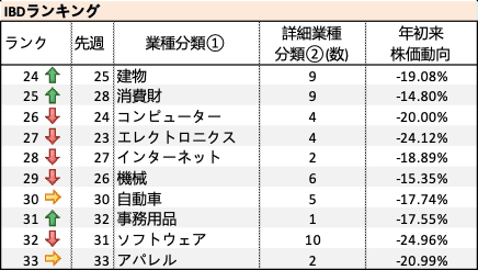 詳細業種分類ごとに、年初来の増加率以外の要素も含めて強い業種を並べた IBD ランキング。