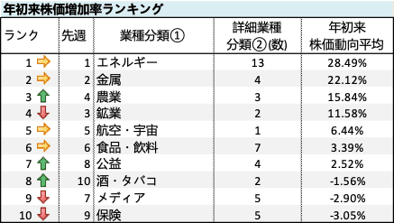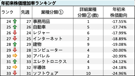 *年初来株価動向は、詳細業種分類 ② 別の平均でランキングは高い順に示している