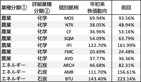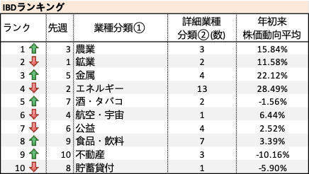 今週はの IBD ランキングは入れ替わりが結構見られましたね。エネルギーはランキングが落ち、農業と金属の勢いが目立っています。